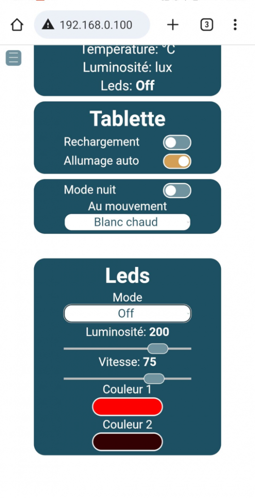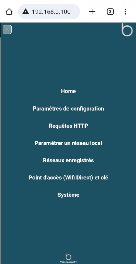 Pour se connecter au module, il faut ouvrir un navigateur internet, et se rendre à l’adresse IP paramétrée. Dans mon cas, je tappe: 192.168.0.100 dans la barre.