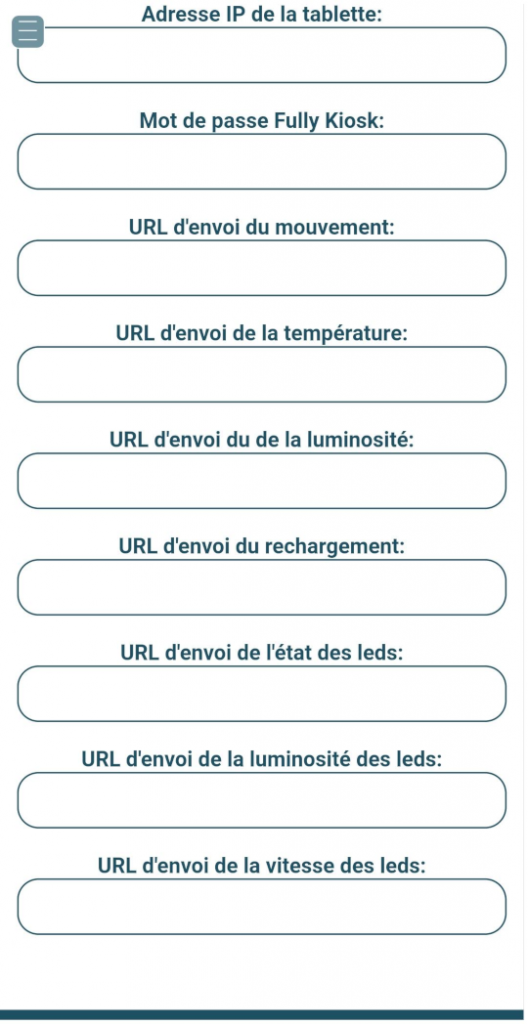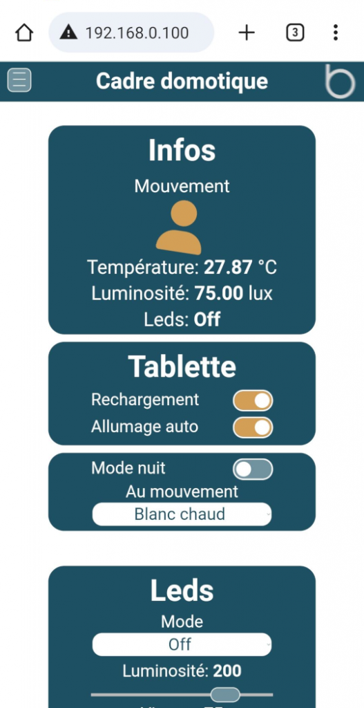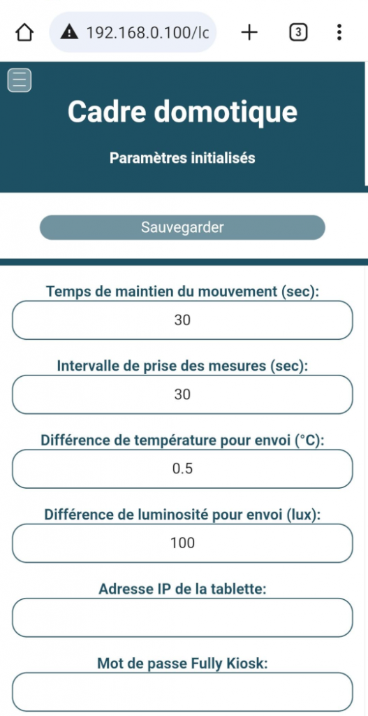 Lors d’un changement d’état du cadre de la tablette (mouvement, température > valeur paramétrée plus haut, état des leds, etc…) le programme envoie une requête HTTP. Ce paramètre doit contenir #value# qui sera remplacé par la valeur mesurée ou captée.