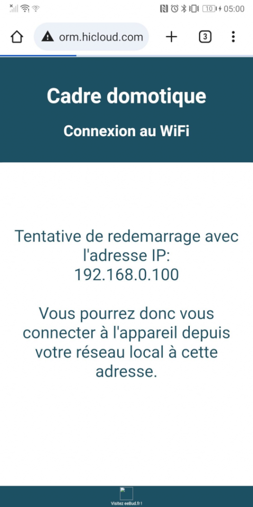 Le module redémarre et tente de se connecter à l’adresse IP paramétrée. Si celle-ci n’est pas disponible, elle se connectera à une autre adresse et il faudra alors se débrouiller pour la retrouver! 😅