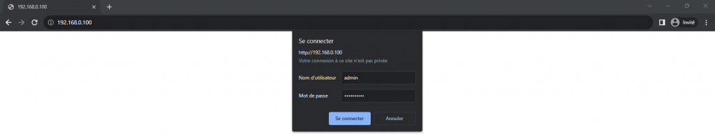 Il faut ensuite saisir les identifiants. Nom d’utilisateur sera “admin” et le mot de passe, sera celui paramétré précédemment.