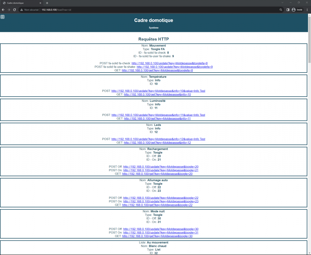 POST Off: http://192.168.0.100/update?key=Motdepasse&toogle=20