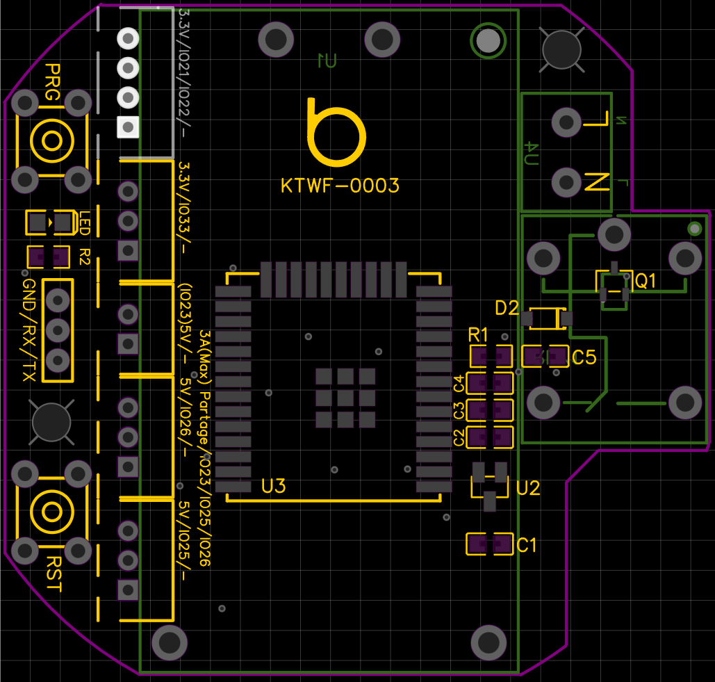 - RST et PRG => Boutons de programmation. Pour activer le mode de programmation, maintenir le bouton RST appuyé, et presser le bouton PRG. Relâchez ensuite RST, puis PRG. Le module est maintenant en mode de programmation. Après programmation, réaliser un reset avec le bouton RST. (Non nécessaire pour programmation OTA)