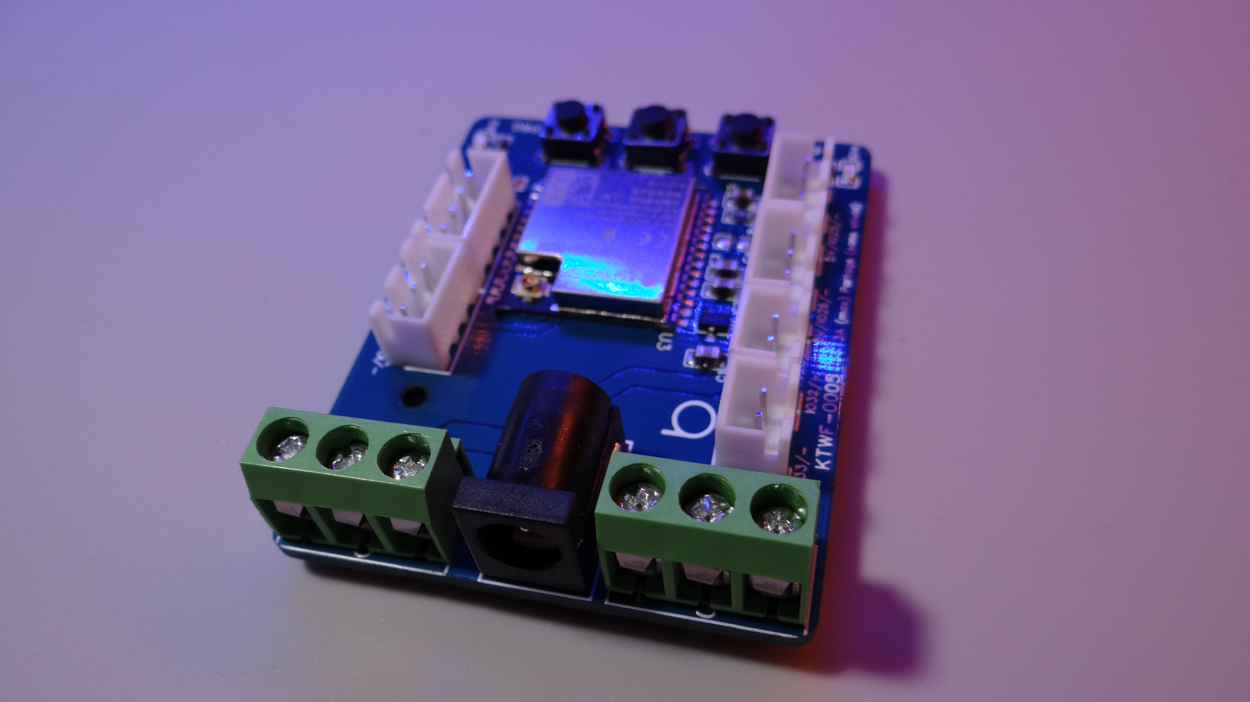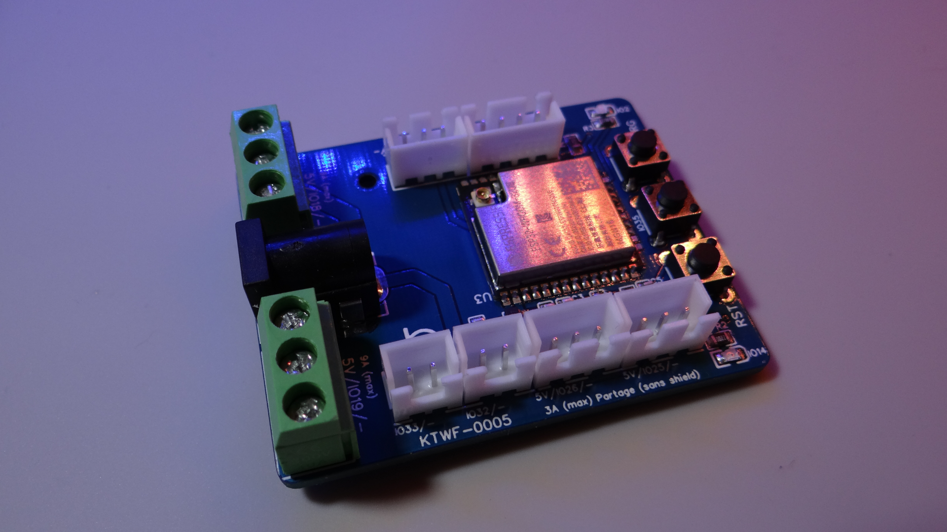 Ce module KTWF-0005 basé sur un module ESP32, est conçu pour une utilisation libre supportant une alimentation externe de 5V 10A max. Grace à ses fiches JST XH, il est facile d’y brancher différents modules.