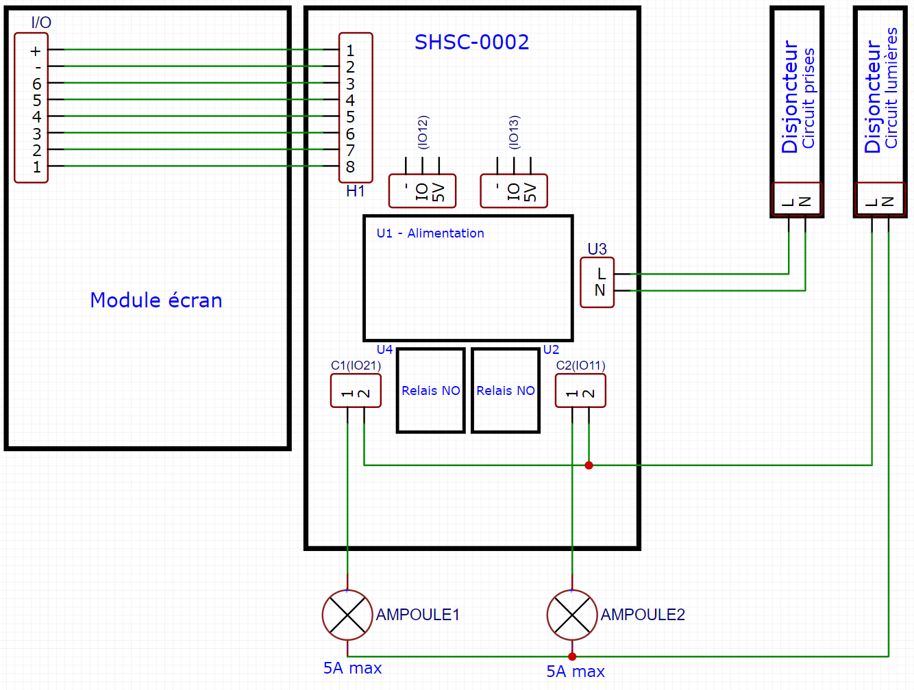 - 2 relais NO de type interrupteurs pouvant être pilotés directement depuis l’écran. (5A max) (IO11, IO21)