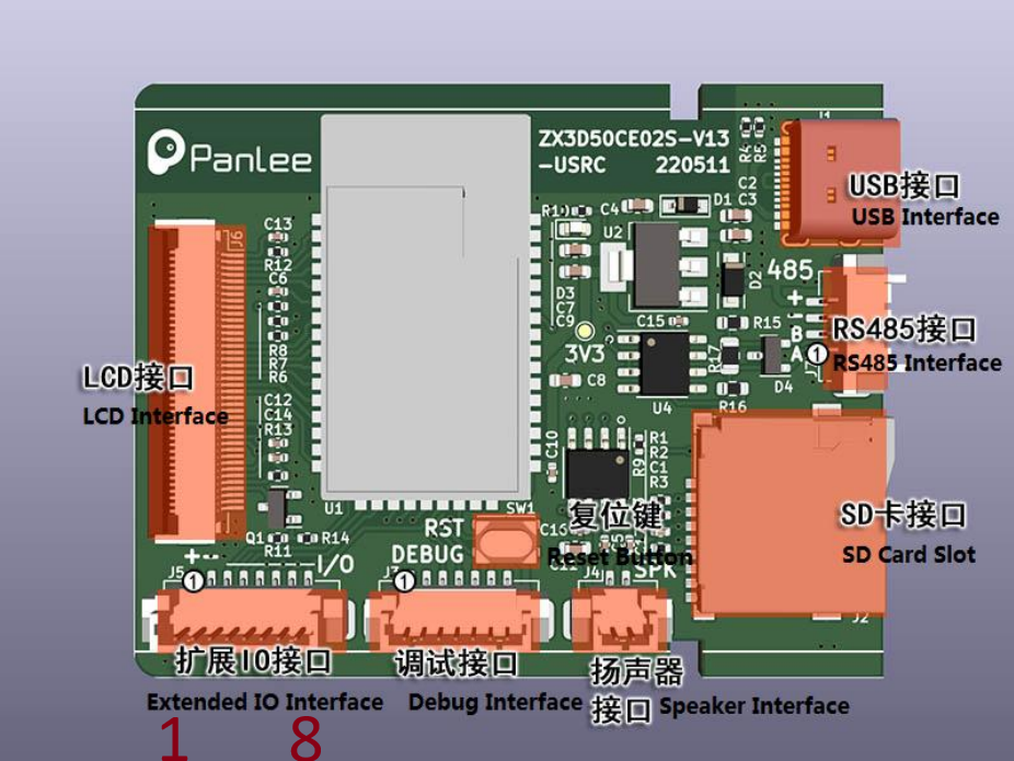 - H1 => Nappe de connexion, +5V/- en haut de la PCB. (Opposé au marquage H1) Veuillez repérer la numérotation (1 et 8) sur le shield et l’écran (Extended IO Interface)